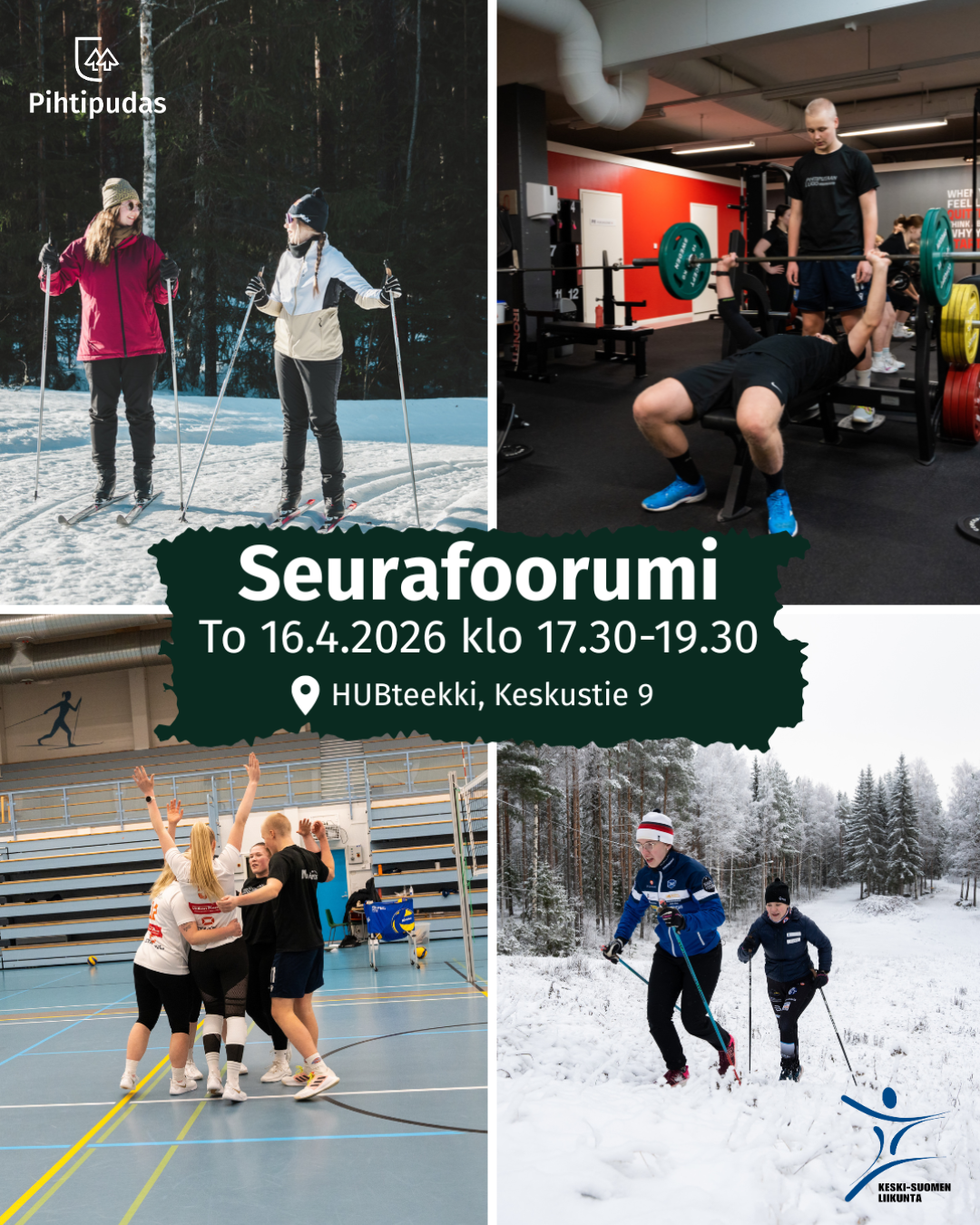 Pihtiputaan kunta ja Keski-Suomen Liikunta kutsuvat Pihtiputaan liikunta- ja urheiluseurojen edustajat mukaan Seurafoorumiin HUBteekille, Keskustie 9 torstaina 16.4. klo 17.30-19.30.