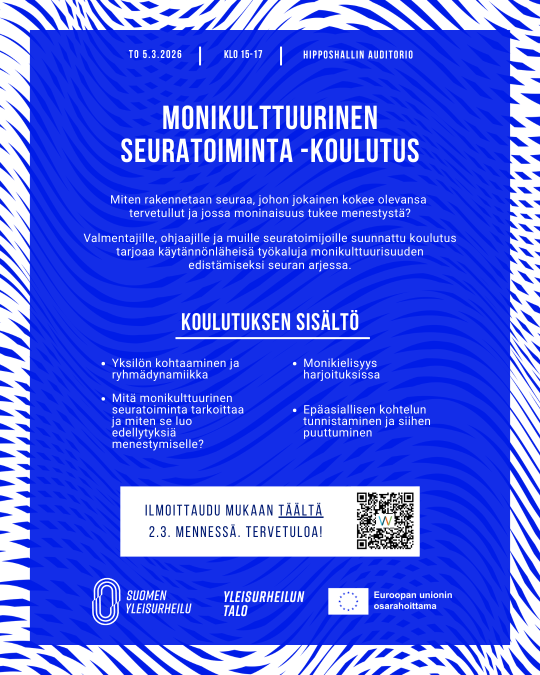 Aurinkoista helmikuuta ja tervetuloa mukaan valmentajille, ohjaajille ja muille seuran toimijoille suunnattuun Monikulttuurinen seuratoiminta -koulutukseen! Koulutus on maksuton ja avoin kaikille urheiluseuroille.
